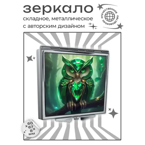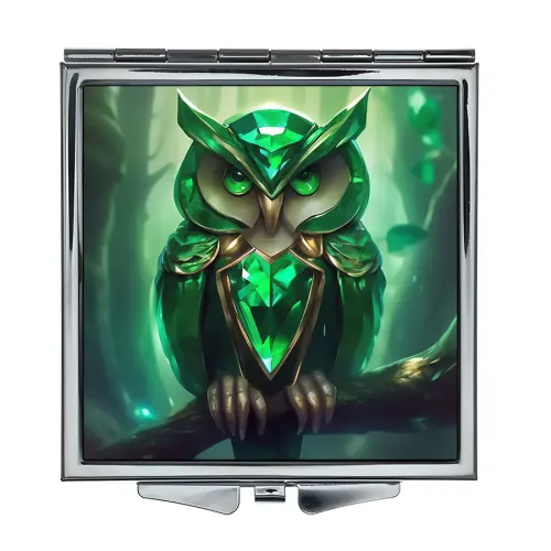 Складное квадратное зеркало с полноцветным изображением зелёной совы на металле.