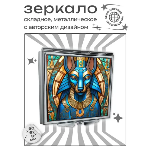Складное зеркало квадратного формата с изображением Анубиса. Изготовлено из металла и стекла.