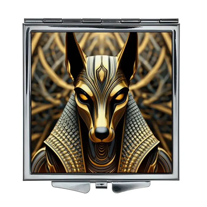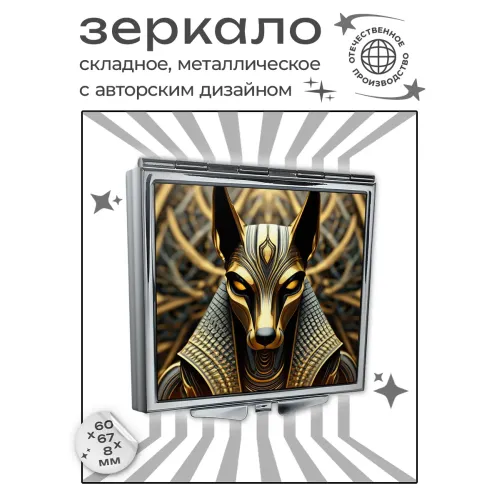 Складное зеркало квадратной формы с изображением бога Анубиса. Материалы: металл и стекло.