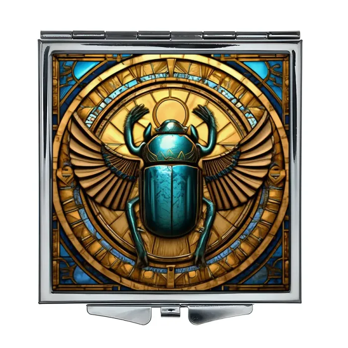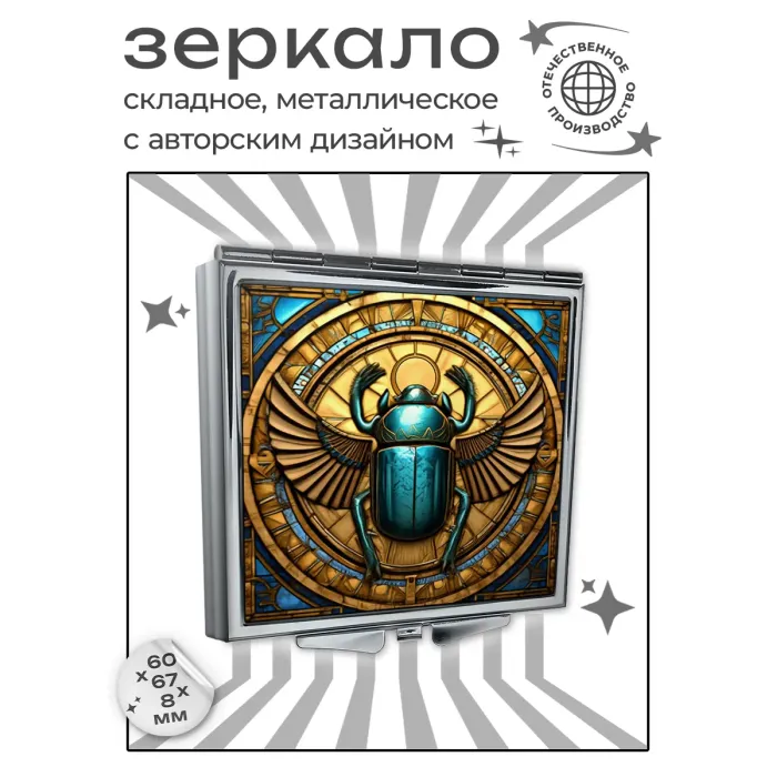 Складное зеркало квадратной формы с изображением жука-скарабея. Материалы: металл и стекло.