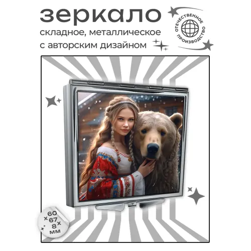Складное квадратное зеркало с полноцветным изображением «Девушка и медведь».