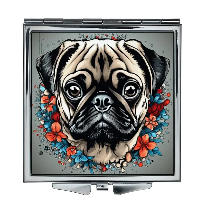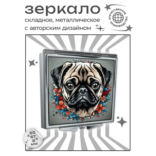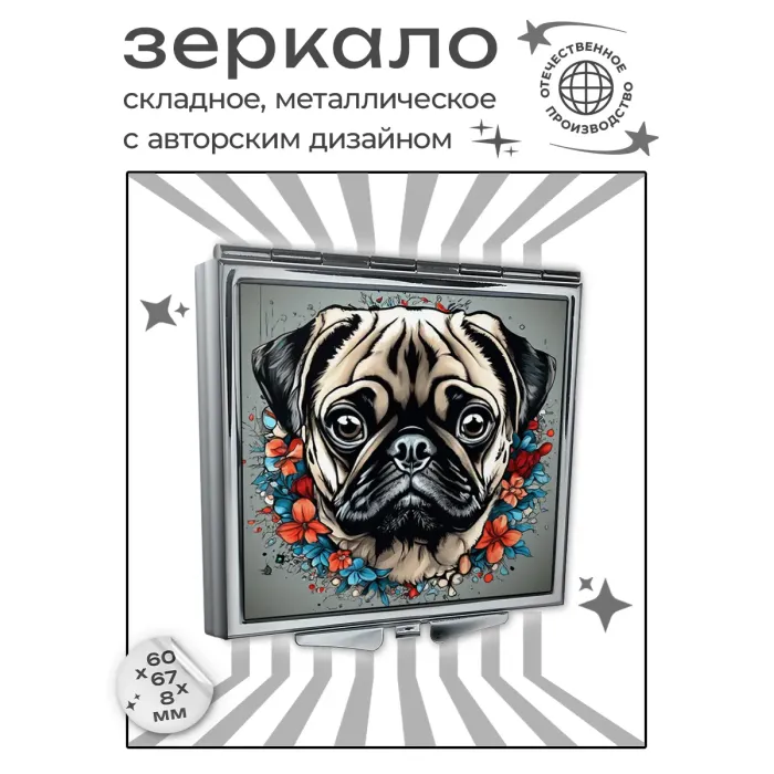 Складное зеркало квадратной формы с изображением мопса. Изготовлено из металла и стекла.