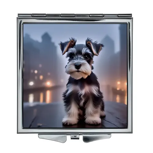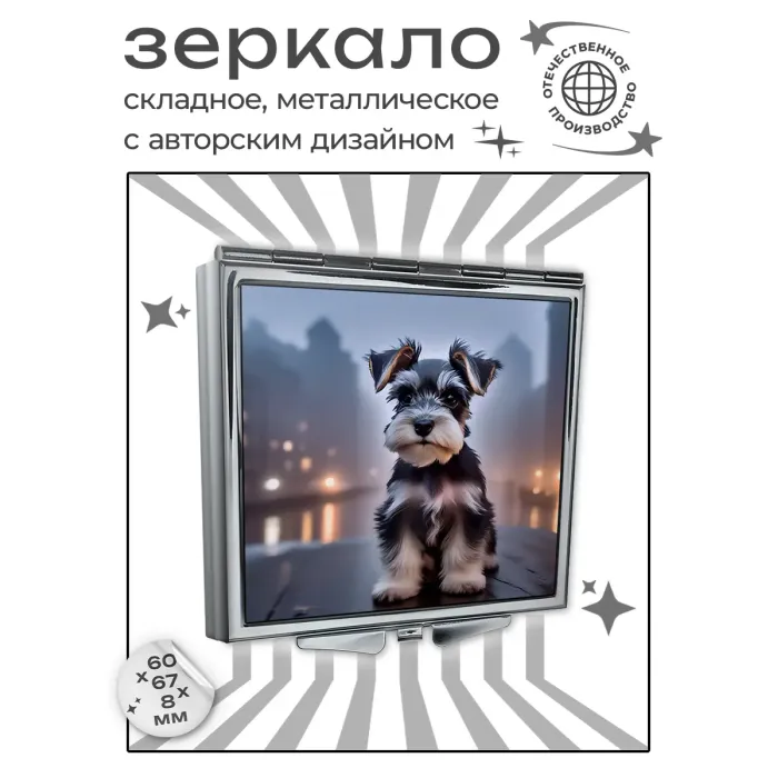 Складное зеркало квадратной формы с изображением терьера. Изделие выполнено из металла и стекла.