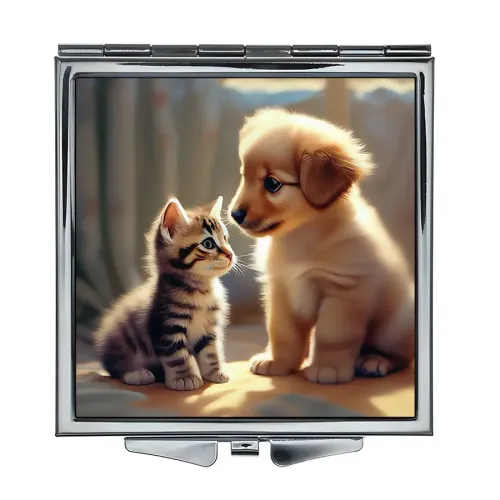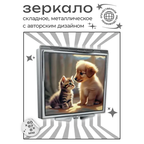 Складное зеркало квадратной формы с полноцветным изображением щенка и котёнка.