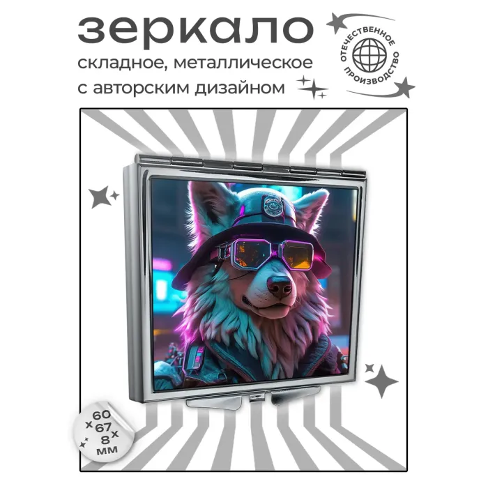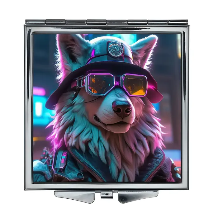 Складное зеркало квадратной формы с изображением служебной собаки. Изготовлено из металла и стекла с полноцветной печатью.