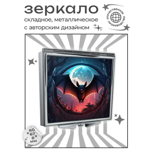 Складное зеркало квадратной формы с изображением летучей мыши. Изготовлено из металла и стекла.