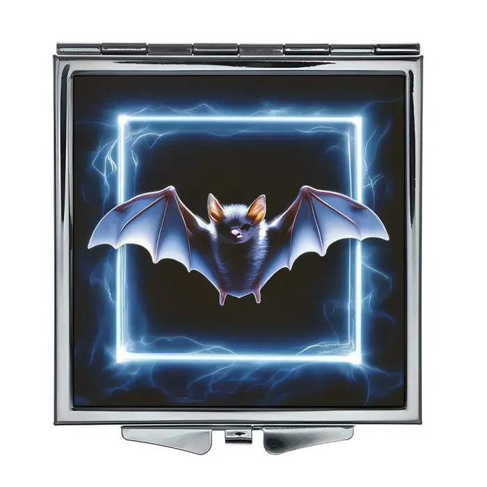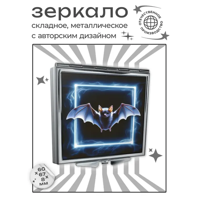 Складное зеркало квадратной формы с изображением летучей мыши в неоновом стиле. Изготовлено из металла и стекла.