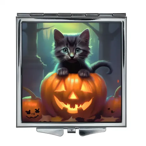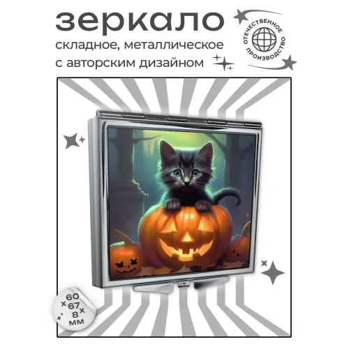 Складное зеркало квадратной формы с изображением котёнка и хэллоуинской тыквы.