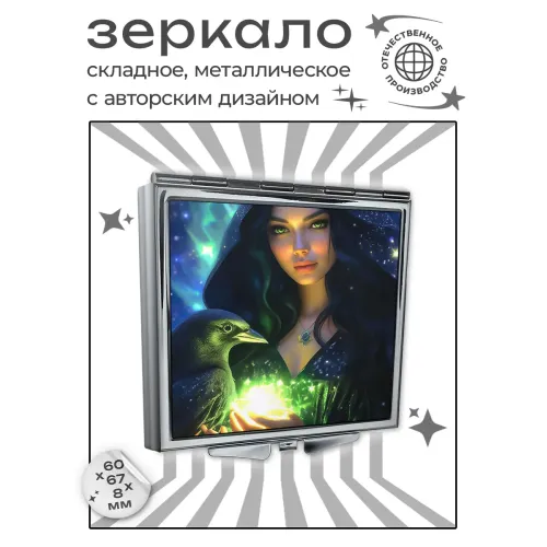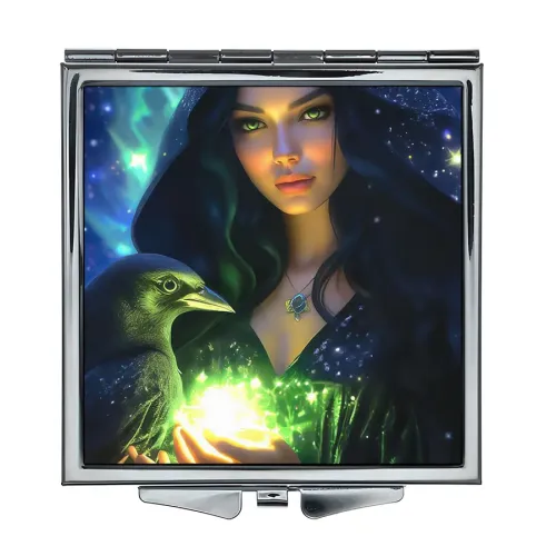 Складное квадратное зеркало с полноцветным изображением «Молодая ведьма с птицей».