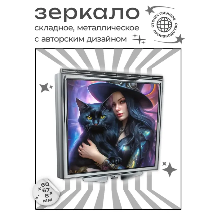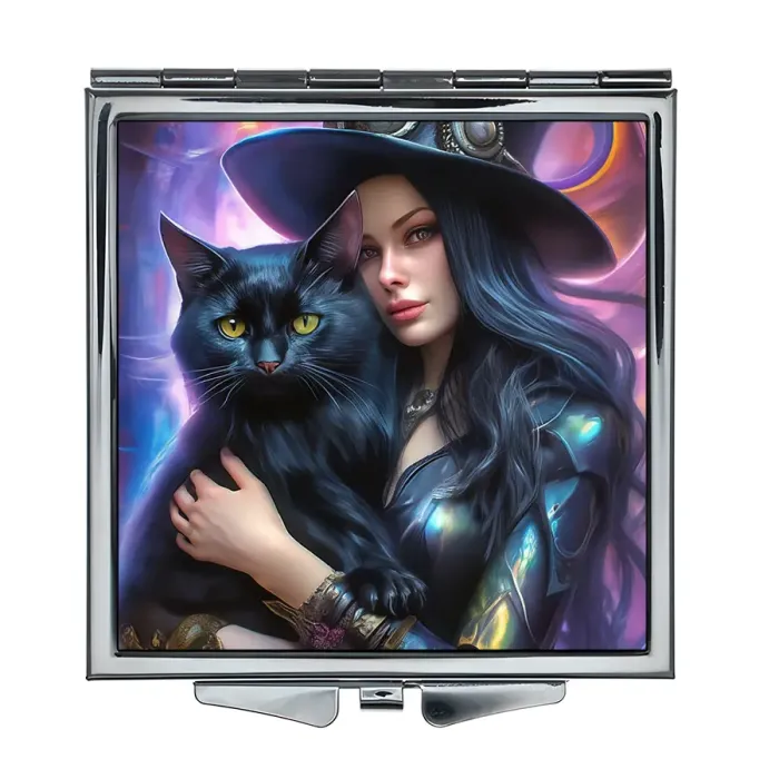 Складное квадратное зеркало с полноцветным изображением колдуньи и черной кошки.