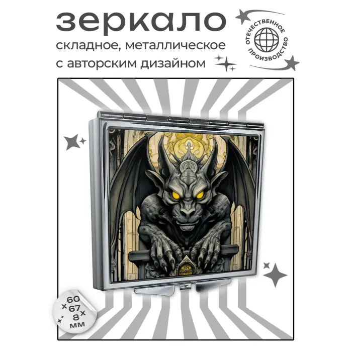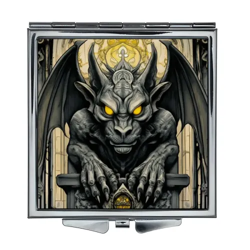 Складное зеркало квадратной формы для личного использования с изображением горгульи.