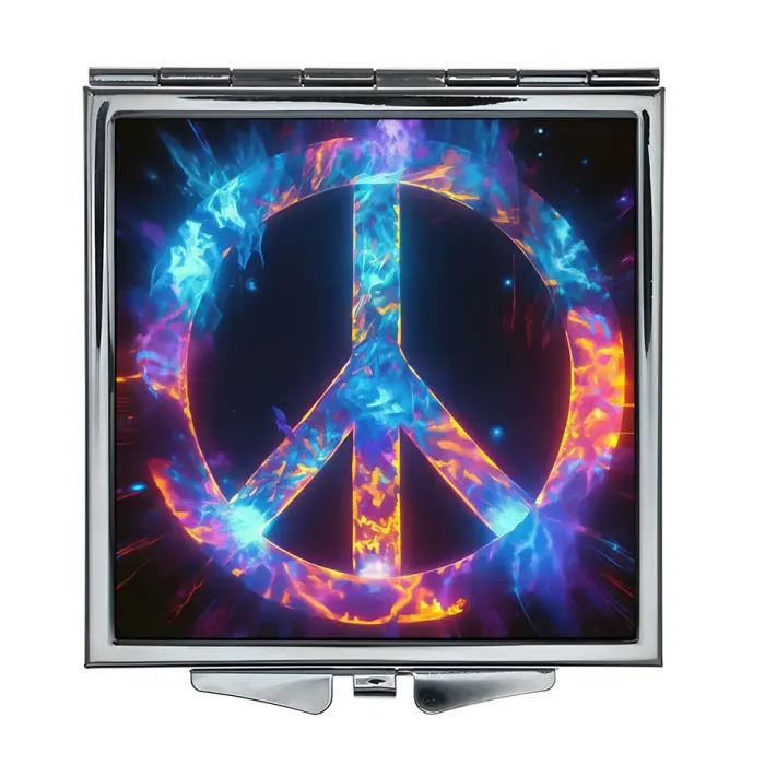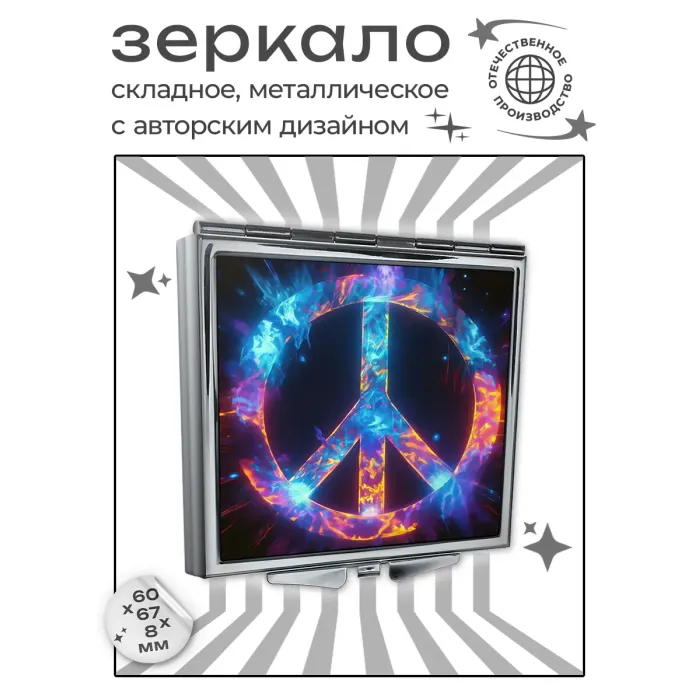 Складное зеркало квадратной формы с полноцветным изображением на металлической основе.