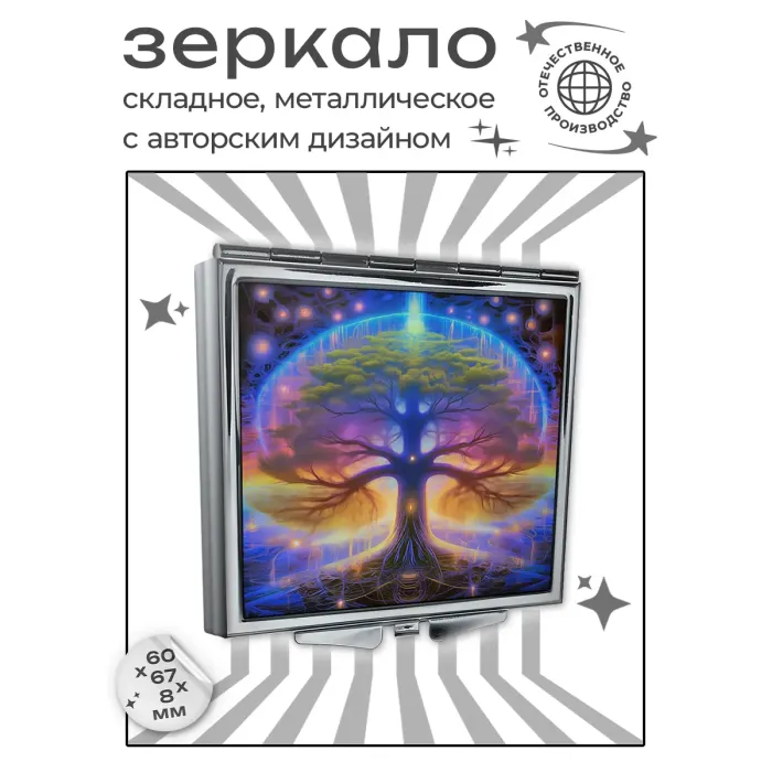 Складное зеркало квадратной формы с изображением Космического дерева жизни. Изготовлено из металла и стекла.