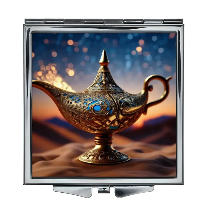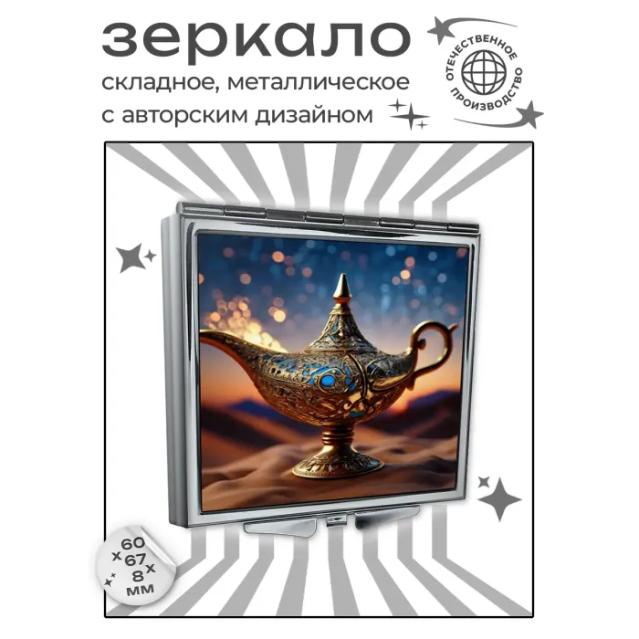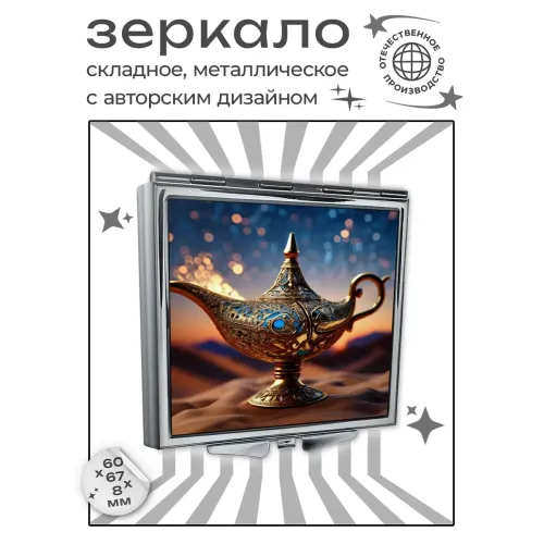 Складное зеркало квадратной формы с изображением Лампы Аладдина. Изделие выполнено из металла и стекла.