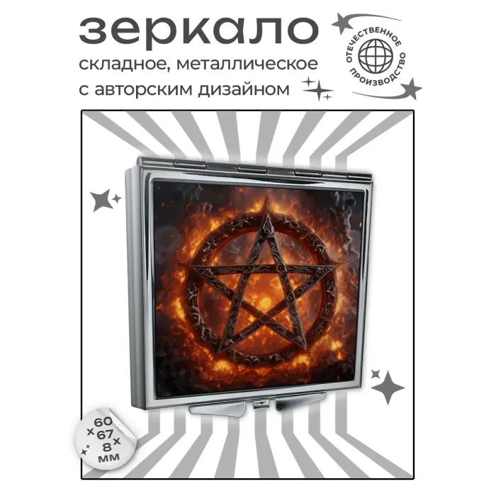 Складное зеркало квадратной формы из металла и стекла с полноцветным изображением пентаграммы.