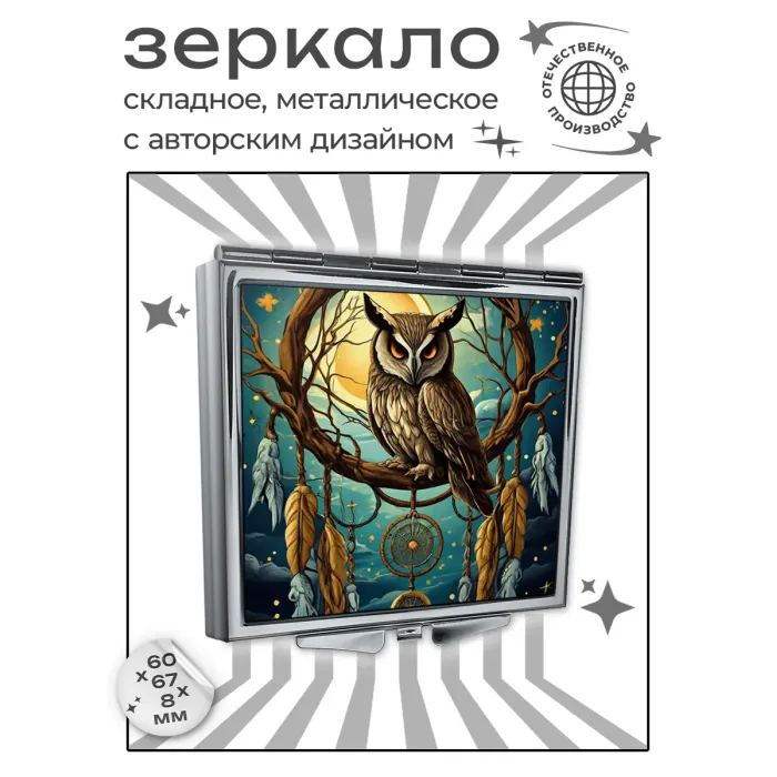 Складное зеркало квадратной формы с изображением совы.