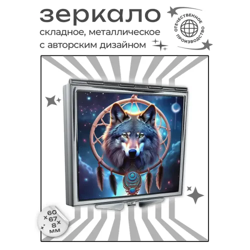 Складное зеркало квадратной формы с изображением волка. Изготовлено из металла и стекла.