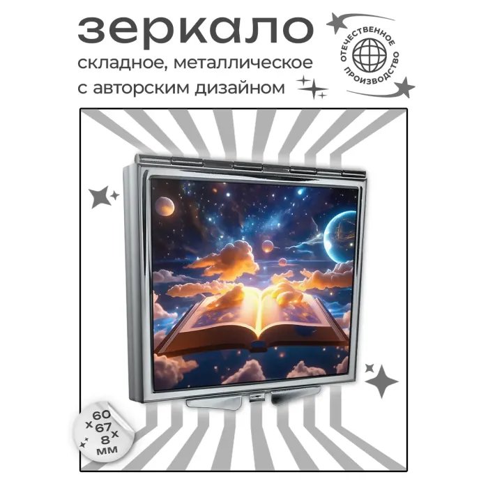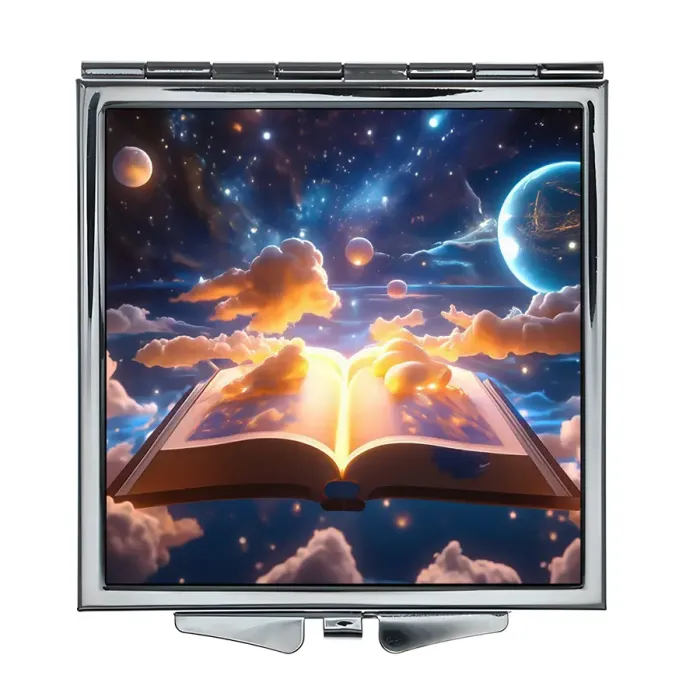 Складное квадратное зеркало для личного использования с полноцветным изображением «Волшебная книга» на металлической основе.