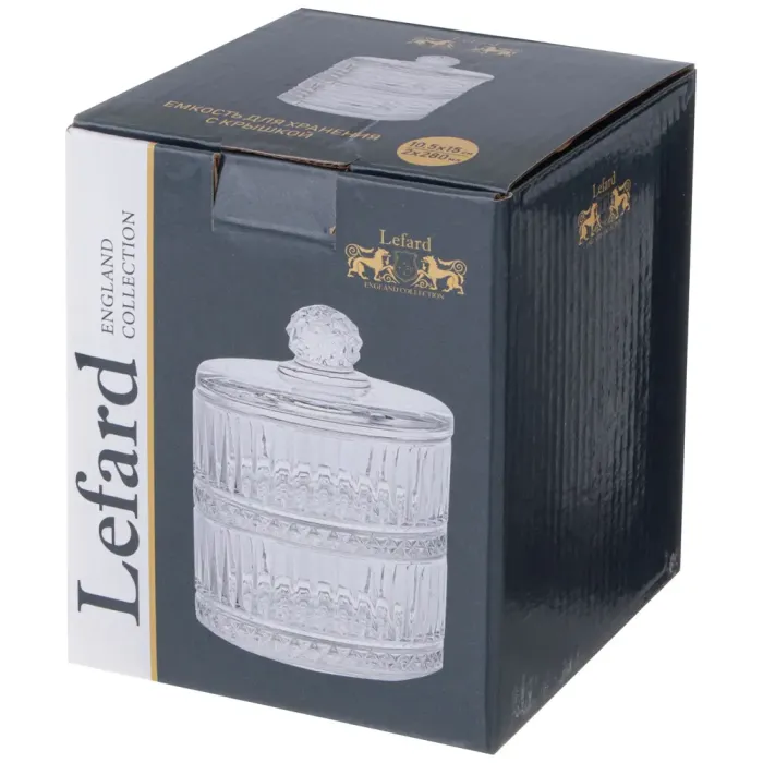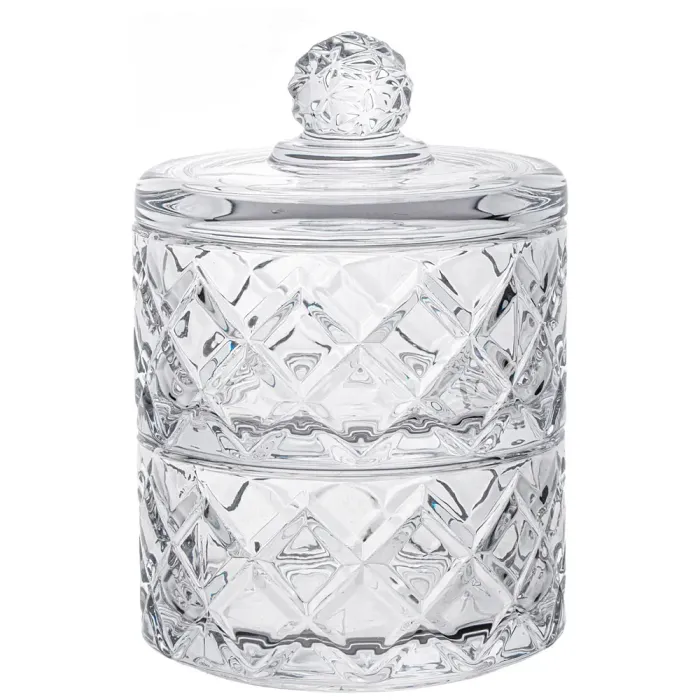 Емкость состоит из двух отдельных ярусов, каждый из которых выполнен из высококачественного стекла, обеспечивающего гигиеничность и визуальный контроль содержимого. Каждый ярус оснащён собственной плотно прилегающей крышкой, что защищает предметы от пыли. Конструкция с двумя уровнями позволяет эффективно использовать вертикальное пространство.