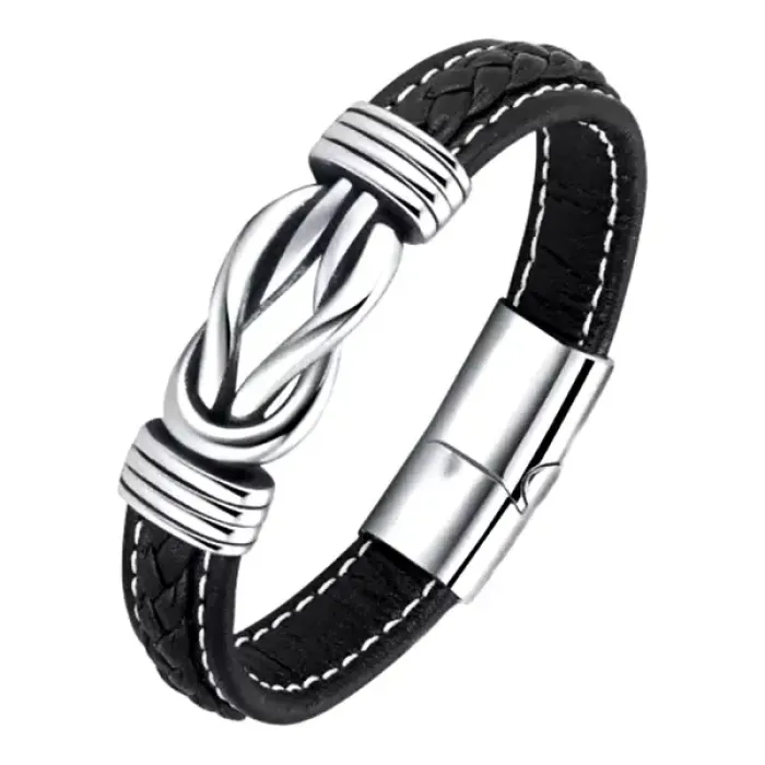 Кожаный браслет из бижутерного сплава с покрытием под серебро и натуральной кожи.
