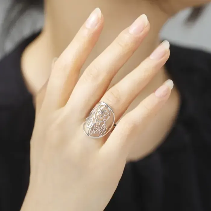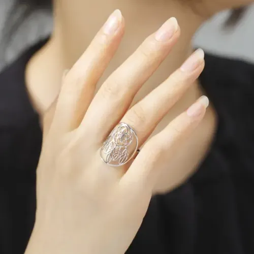 Безразмерное кольцо 'Ловец снов' из бижутерного сплава с покрытием под серебро.