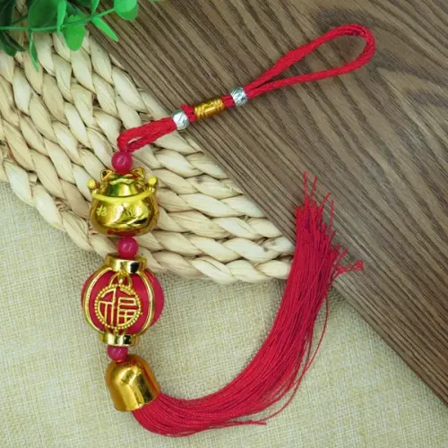 Подвеска в виде фигурки Манеки-неко с фонариком, сувенирный декор из металла и текстиля.