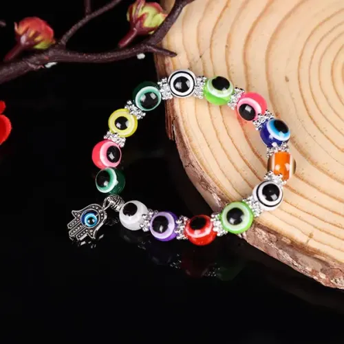 Стрейч-браслет от сглаза с бусинами, который сочетает в себе защитные свойства и стильный дизайн. Этот аксессуар выполнен из стеклянных, пластиковых и металлических бусин с покрытием под серебро. Диаметр каждой бусины составляет 10 мм, что делает браслет удобным для ношения на запястье. Браслет традиционно ценится за свою символику защиты от негативной энергии и сглаза, что придаёт ему особый смысл в культуре многих народов. Идеален как для повседневного использования, так и для особых случаев.