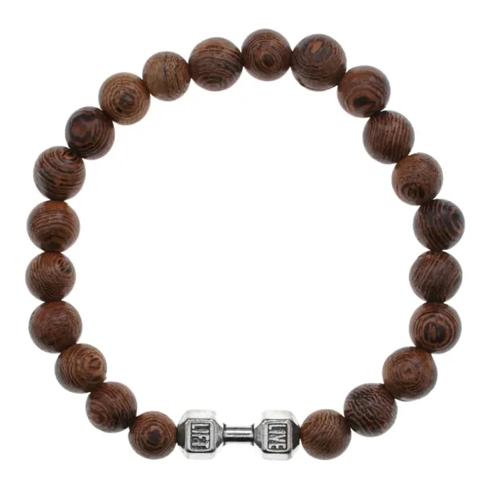Деревянный стрейч-браслет с металлическими элементами в виде гантелей.