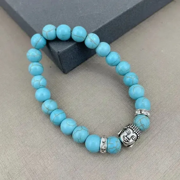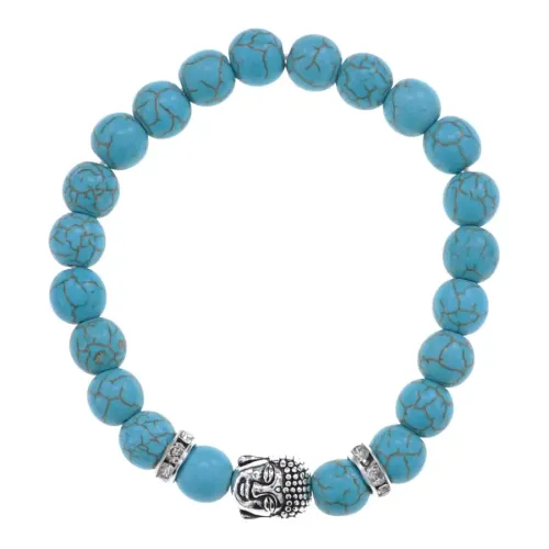 Стрейч-браслет с бусинами из синтетической бирюзы и металлическими элементами.