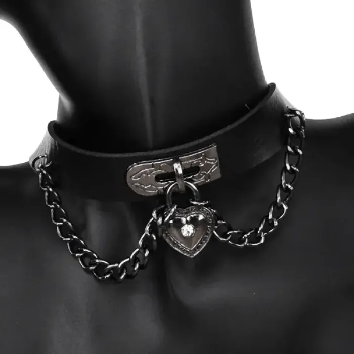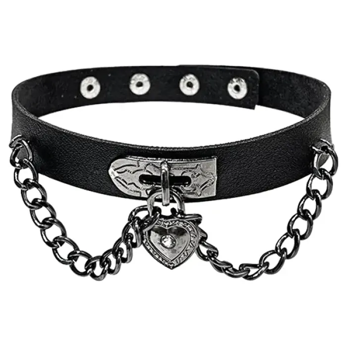 Чокер из искусственной кожи и металла с декоративной вставкой в виде сердца, украшенной стразами.