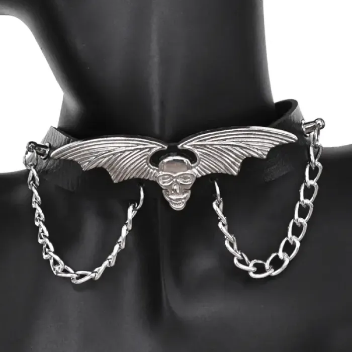 Чокер «Летучая мышь и череп» — аксессуар из искусственной кожи и металла с регулируемой длиной.