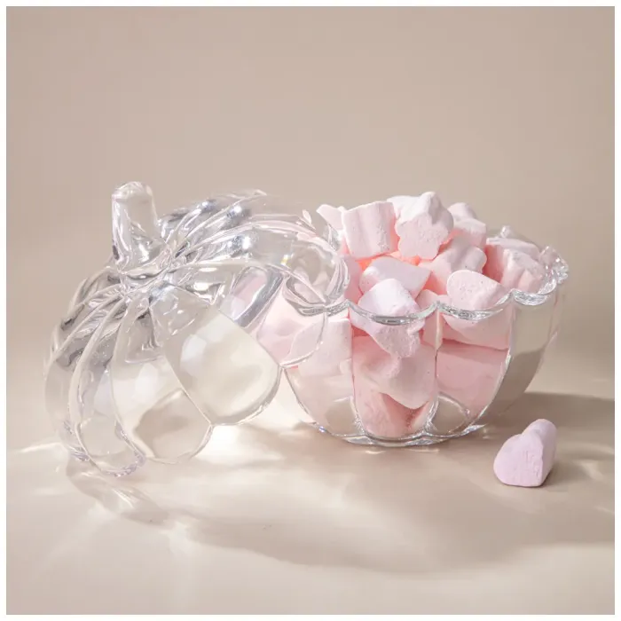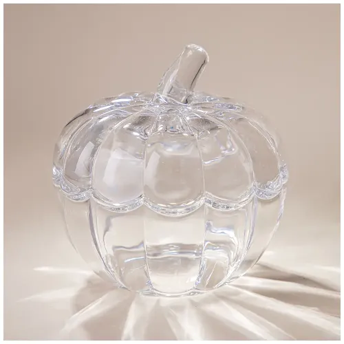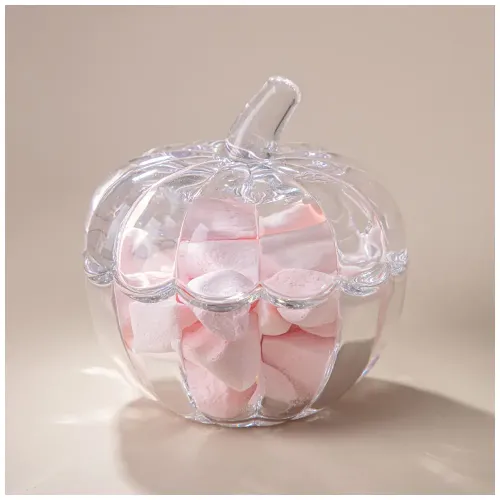 Изделие изготовлено из стекла, которое не влияет на запах и вкус хранимых продуктов. Материал устойчив к мыльной воде, что упрощает уход. Конструкция включает крышку, обеспечивающую герметичность хранения, и имеет компактную кубическую форму с декоративными элементами, имитирующими тыкву.