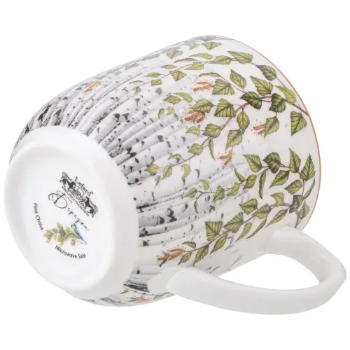 Кружка выполнена из тонкостенного упрочнённого фарфора, что повышает её устойчивость к механическим воздействиям. Поверхность изделия украшена декором с изображением берёз. Функциональная ручка обеспечивает удобный захват.