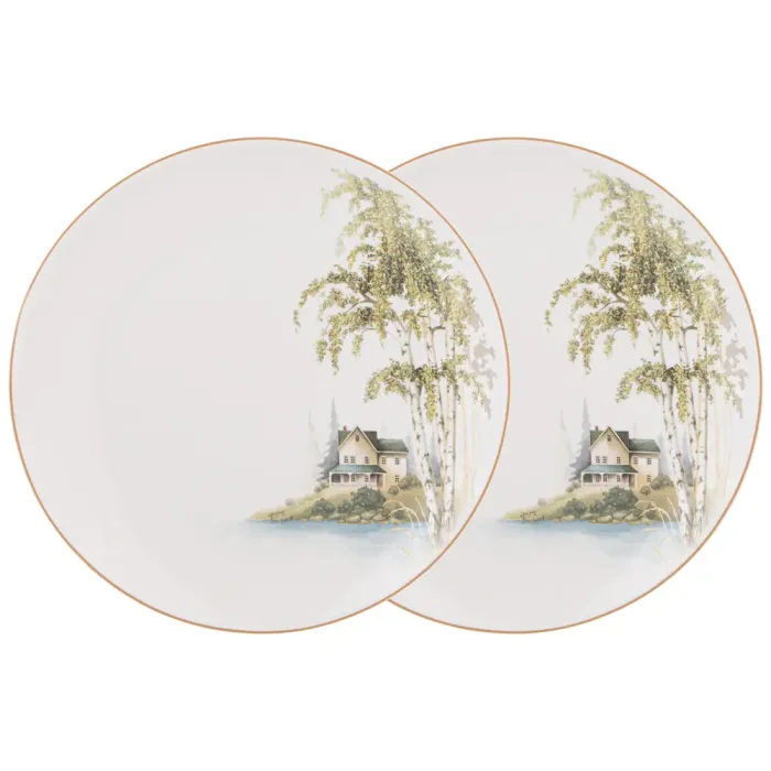 Набор из двух закусочных тарелок диаметром 20,5 см предназначен для сервировки стола. Изделия бренда Lefard из коллекции «Березки» изготовлены из упрочнённого фарфора и украшены тематическим декором.