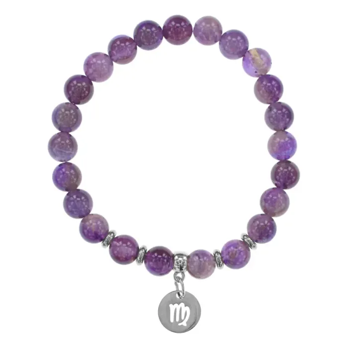 Стрейч-браслет для ношения, выполненный из натурального аметиста с подвеской в виде знака зодиака Дева.