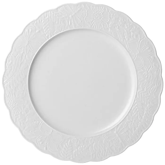 Тарелки выполнены из фарфора, обожжённого при высокой температуре, что повышает их прочность, термостойкость и устойчивость к царапинам. Поверхность украшена рельефным декором с цветами и бабочками. Классическая круглая форма и стандартный диаметр подходят для подачи разнообразных блюд.