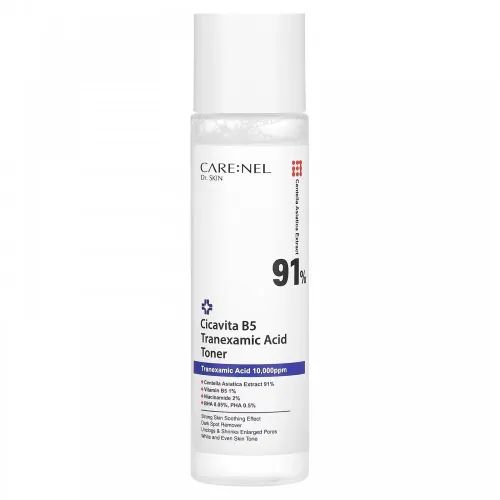 Тонер Cicavita B5 Tranexamic Acid Toner — это высокоэффективное средство для ухода за кожей лица, разработанное для улучшения ее состояния и придания здорового вида. Основной компонент тонера — экстракт центеллы азиатской (91%), который оказывает успокаивающее действие и укрепляет кожный барьер. Транексамовая кислота (1%) способствует осветлению тёмных пятен и выравниванию тона кожи. AHA и BHA-кислоты эффективно очищают кожу от омертвевших клеток и избытка кожного сала.