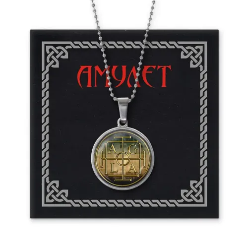 Сувенирный кулон-амулет «Колесо Фортуны» выполнен из бижутерного сплава с покрытием под серебро. Изображение защищено выпуклой стеклянной линзой.