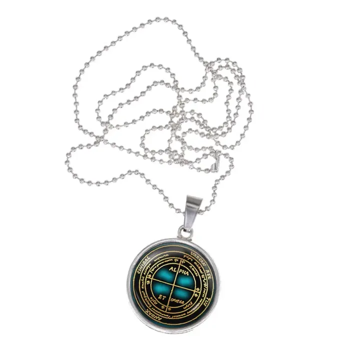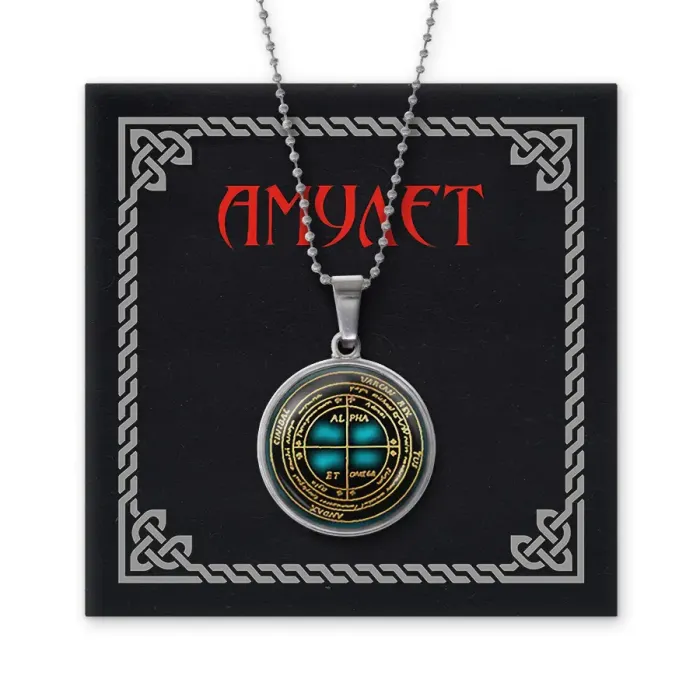Сувенирный кулон-амулет из бижутерного сплава с покрытием под серебро и выпуклой стеклянной линзой.