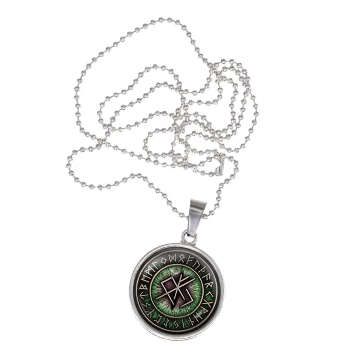 Сувенирный кулон-амулет из бижутерного сплава с покрытием под серебро и выпуклой стеклянной линзой.
