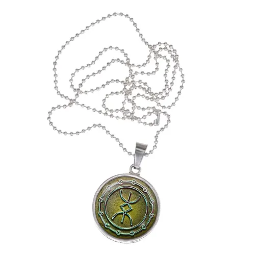 Сувенирный кулон-амулет из бижутерного сплава с покрытием под серебро. Изображение руны расположено под выпуклой стеклянной линзой.