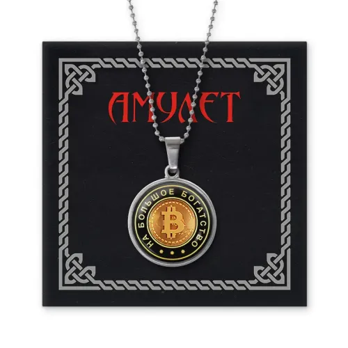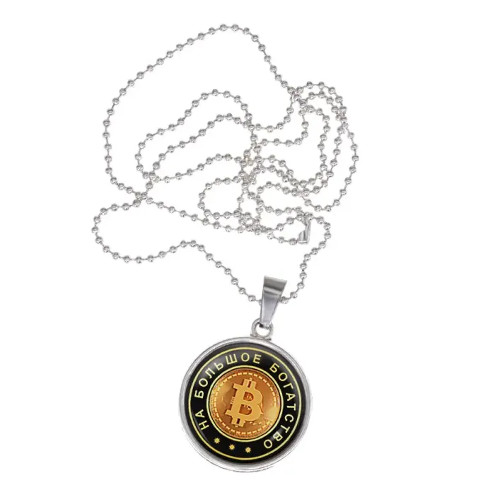 Сувенирный кулон-амулет с символом биткойна из бижутерного сплава с покрытием под серебро и защитной стеклянной линзой.