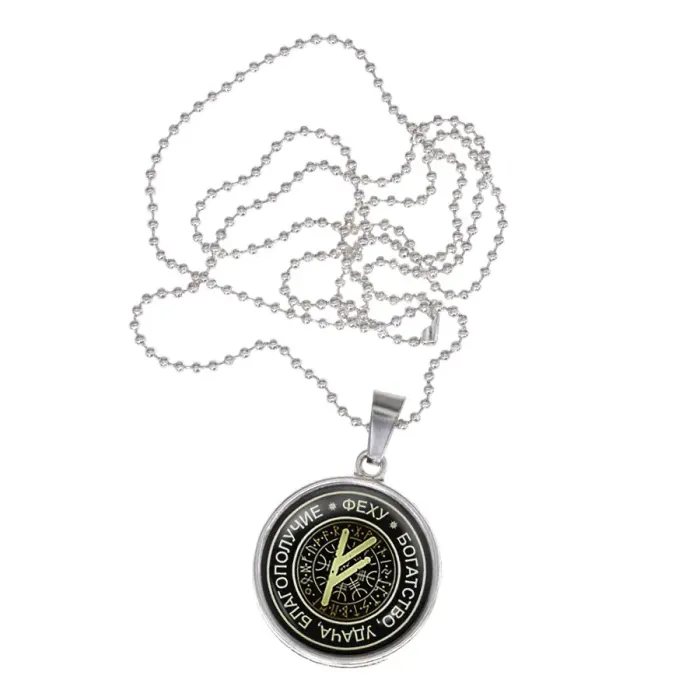 Сувенирный амулет-кулон с изображением руны Феху, выполненный из бижутерного сплава с покрытием под серебро. Изображение защищено выпуклой стеклянной линзой.