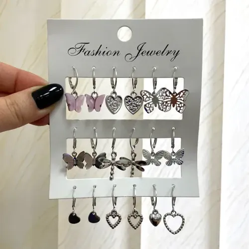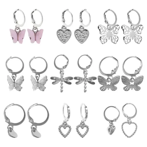 Набор из девяти пар серег для носки. Материал — бижутерный сплав с покрытием под серебро.