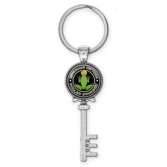 Брелок для ключей из бижутерного сплава в виде лягушки с символикой богатства. Изображение защищено выпуклой стеклянной линзой.