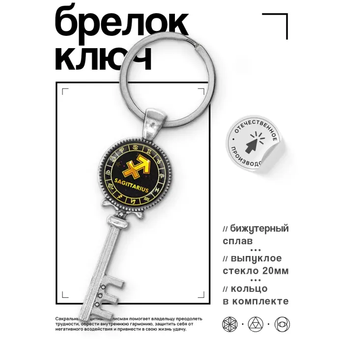Брелок для ключей в виде ключа со знаком зодиака Стрелец. Изготовлен из бижутерного сплава с покрытием под серебро, изображение защищено выпуклой стеклянной линзой.