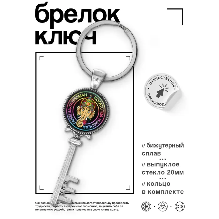 Брелок для ключей из бижутерного сплава с изображением Ганеши под выпуклой стеклянной линзой.