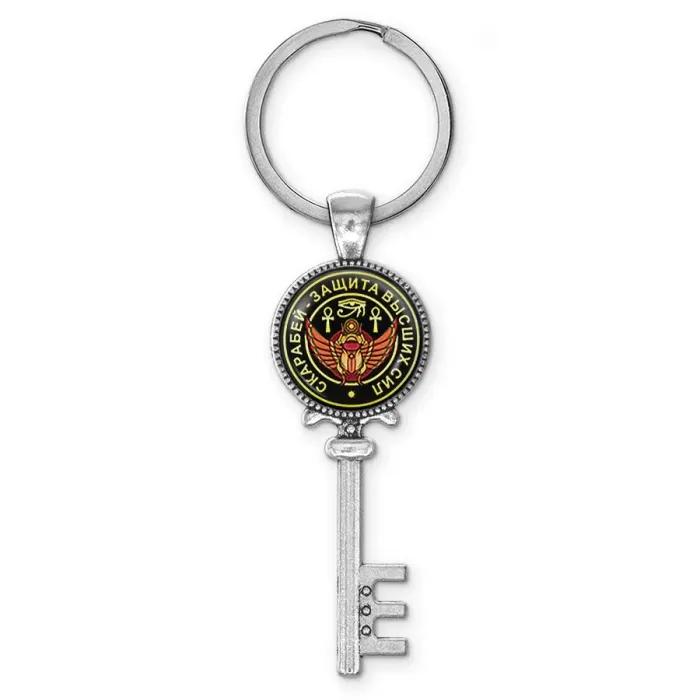Брелок для ключей из бижутерного сплава с изображением скарабея под выпуклой стеклянной линзой.
