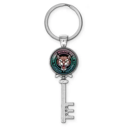 Брелок для ключей из бижутерного сплава с изображением кошки под стеклянной линзой.