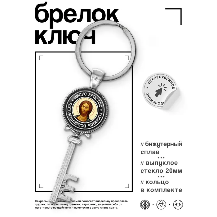 Брелок для ключей из бижутерного сплава с изображением Иисуса Христа под выпуклой стеклянной линзой.